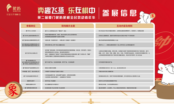 嘉年华现场还设置了象棋主题文化展区,包括当代象棋大师脸谱及象棋文化展、厦门尊龙象棋队精彩回顾及尊龙品牌、公益主题展等,通过丰富的图文资料,带您回顾厦门尊龙象棋队的精彩瞬间,展示出征象甲“新班底”。
